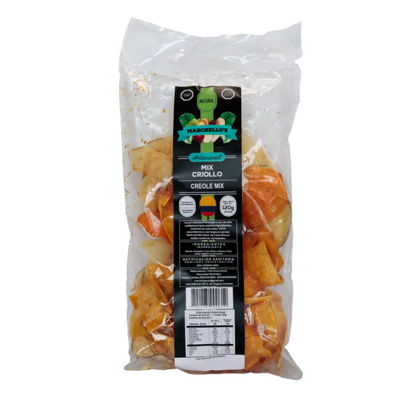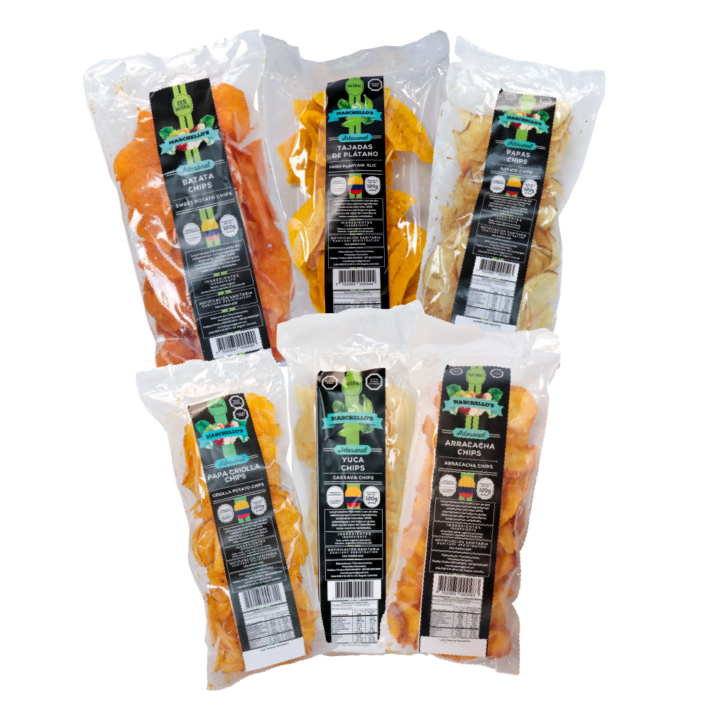 El Marchello’s Mix de 120g es un snack artesanal colombiano que combina una selección de chips vegetales crujientes. Una mezcla de plátano, yuca, arracacha, batata y papa. libres de conservantes y elaborados con ingredientes del campo colombiano.