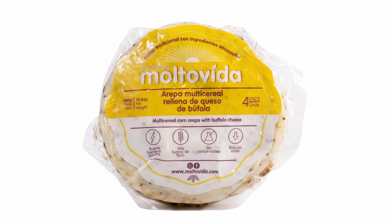 La Arepa Multicereales con Queso Búfala de Moltovida es una opción nutritiva, rellena de queso de búfala, elaborada con maíz entero y una mezcla de súper alimentos (quinua, chía, ajonjolí, linaza, avena) que le aportan fibra, proteína y Omega 3.