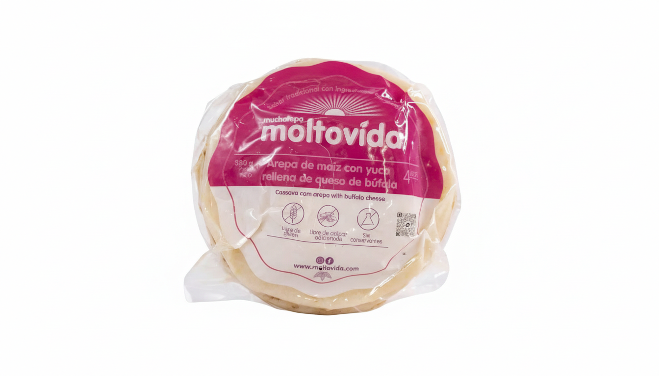 La Arepa de Yuca Rellena de Queso Búfala de Moltovida es una opción saludable y deliciosa, hecha con masa de maíz y harina de yuca, rellena de queso de búfala, destacando por ser libre de gluten, baja en sodio y grasa, y sin conservantes, aportando proteínas y fibra para un desayuno o snack nutritivo.