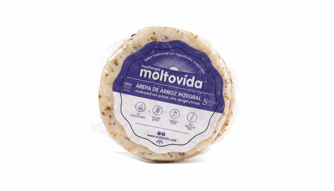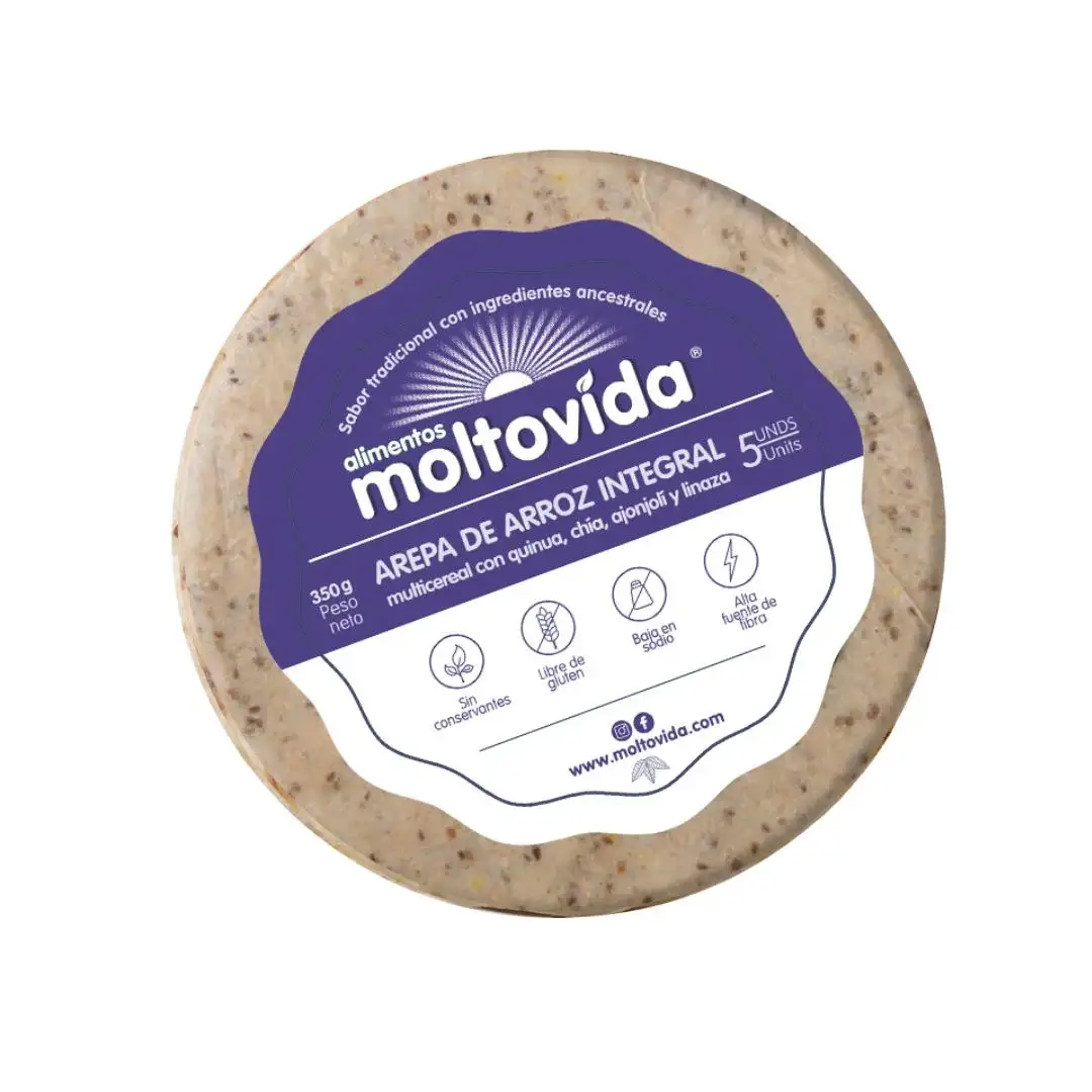 La Arepa de Arroz Integral Multicereal de Moltovida es una opción saludable, sin gluten y baja en sodio, hecha a base de arroz integral, quinua, chía, linaza y ajonjolí, rica en fibra y omega 3, ideal para acompañar o rellenar, ofreciendo una alternativa nutritiva para cualquier momento del día, con beneficios de vitaminas y minerales.