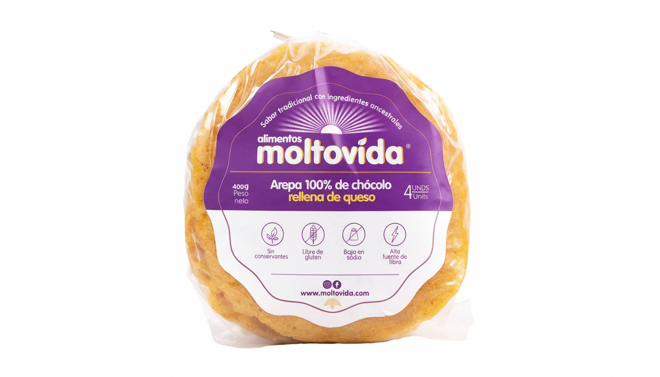 La Arepa de Chocolo Rellena de Queso de Moltovida es una opción nutritiva y deliciosa, hecha con maíz fresco rellena de queso de búfala, combinando lo dulce del maíz con lo cremoso del queso, ofreciendo fibra, proteínas y vitaminas.