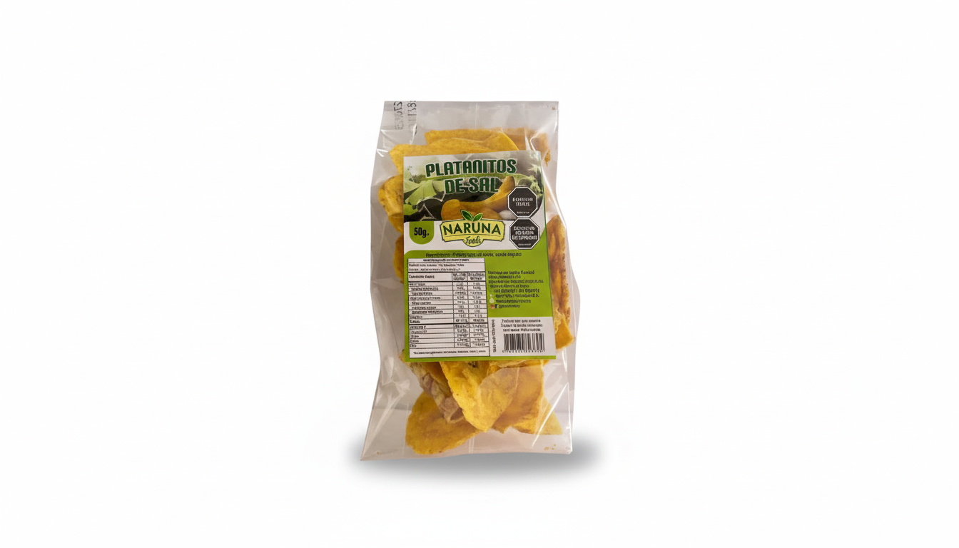 Plátano natural dulce, aceite vegetal. Producto 100% natural, nutritivos y saludables. Podrás disfrutar su crujiente textura y el verdadero sabor del plátano dulce.