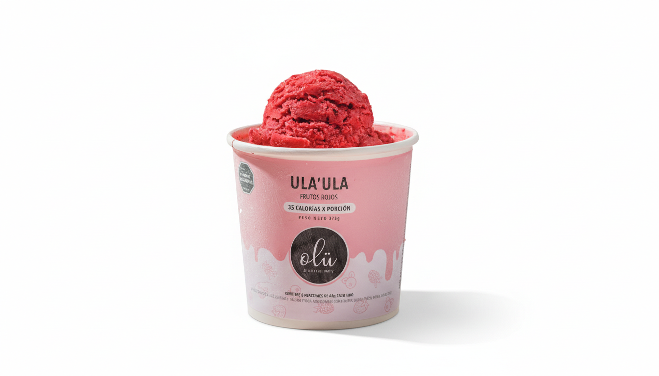 El Helado de Frutos Rojos de Olu es una opción saludable, vegana, sin gluten y sin azúcar añadida, elaborada a base de leche de almendras 100% natural, con una mezcla de fresa, mora y arándanos, endulzado con miel de agave y/o edulcorantes naturales, ofreciendo un sabor intenso y ligero ideal para disfrutar sin culpa.