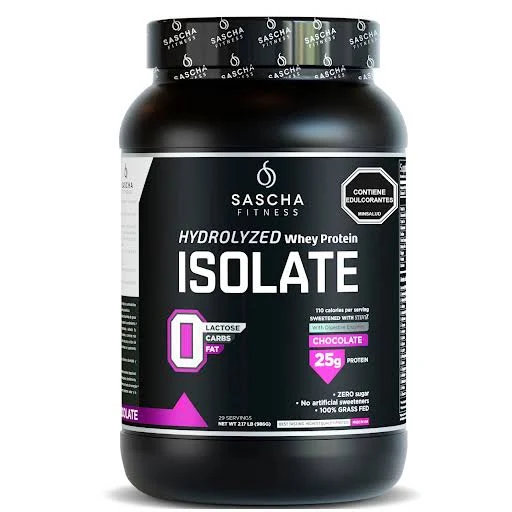 La Proteína Isolate Chocolate de Sascha Fitness es un aislado de suero hidrolizado de alta calidad, libre de gluten, lactosa y azúcar, diseñado para la recuperación y aumento de masa muscular. Contiene 25g de proteína, cero carbohidratos/grasas, edulcorada con stevia, y enriquecida con enzimas digestivas para evitar inflamación.
