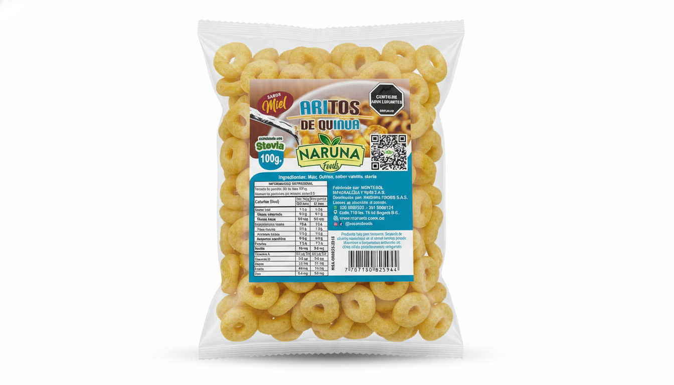 Los Aritos de Quinua con Miel de Naruna Foods son un snack saludable y nutritivo, diseñado como opción de desayuno o merienda energética, libre de culpas. Aportan proteínas completas, fibra y minerales gracias a la quinua, siendo ideales para complementar la dieta diaria, comer con yogur/leche o directamente como snack crujiente.