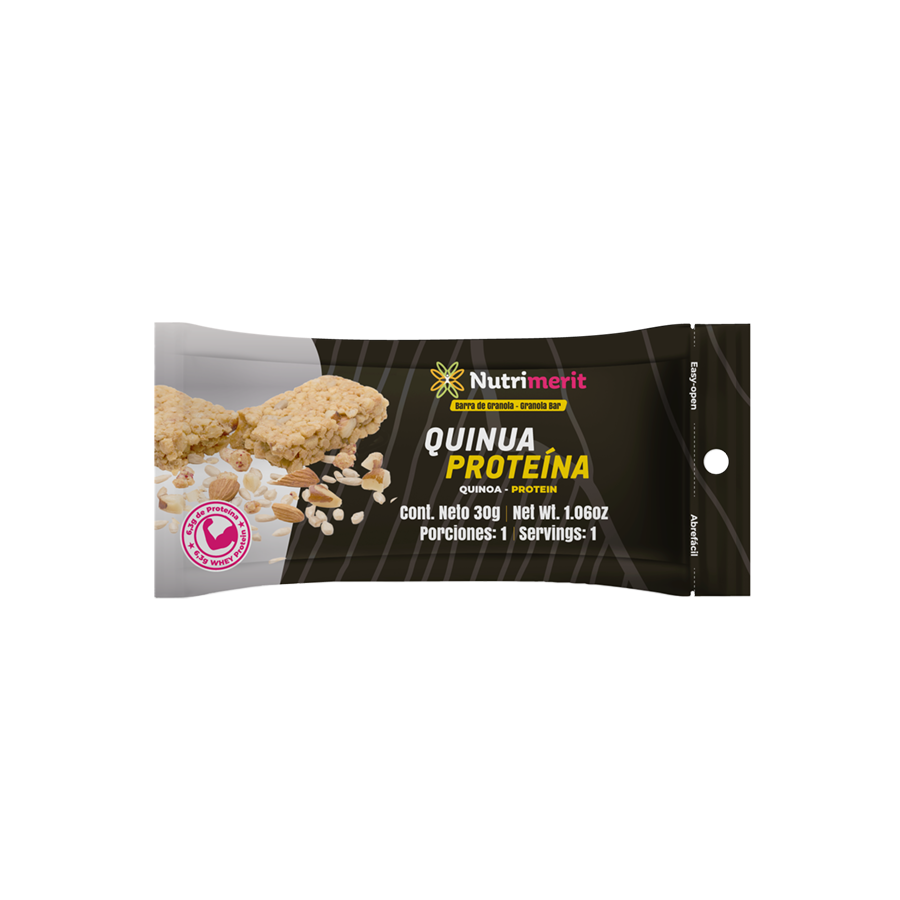 Barra de granola con quinua y proteína de suero, arroz integral, vainilla y sal marina. Alta fuente de proteína, con aceite de oliva y contiene la misma cantidad de proteina que un huevo