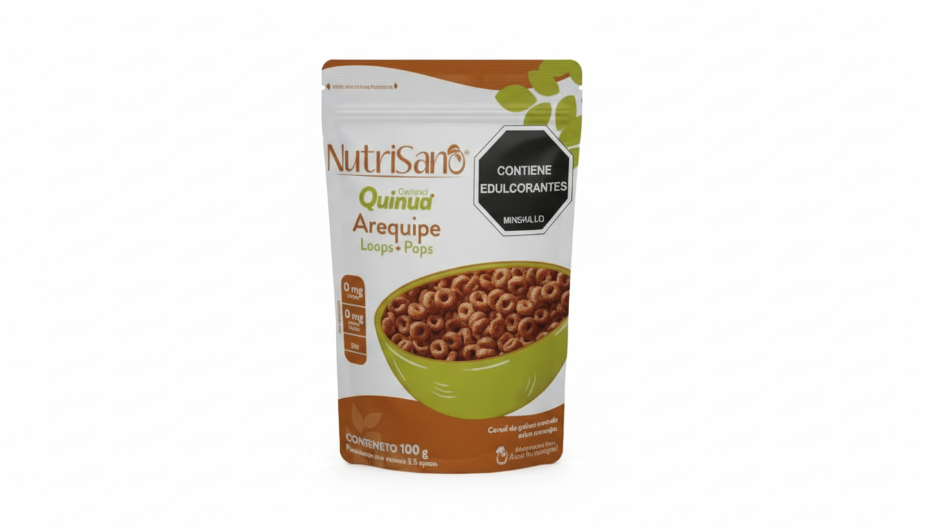 Nutrisano 100g Cereal Quinua Loops Arequipe ofreceAros de quinoa y maíz crujientes, sin gluten, con sabor a caramelo (arequipe), que ofrece una forma nutritiva, rica en proteínas y divertida de comenzar el día, perfecta con leche, yogur o como refrigerio, con edulcorantes agregados como stevia para un sabor equilibrado.