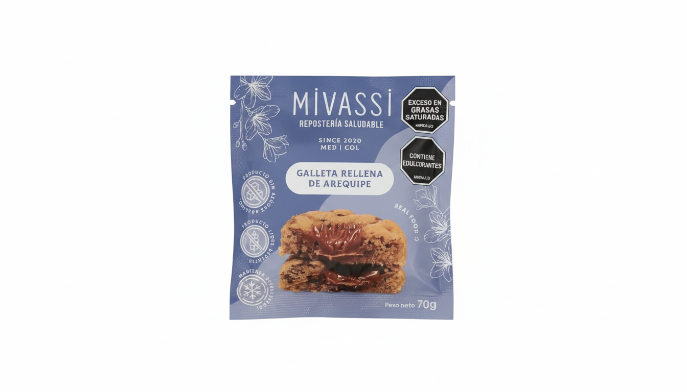 La Galleta Rellena de Arequipe Mivassi (70g) es un snack de repostería saludable, caracterizado por ser libre de azúcar, libre de gluten y bajo en carbohidratos.