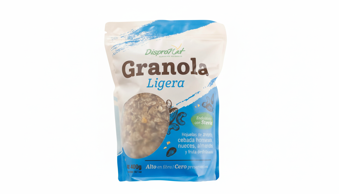 Granola Ligera 400g – Dispronat Alimentos Naturales es una mezcla de granola natural, rica en fibra y sin azúcar (o con azúcar reducida), diseñada para un desayuno o refrigerio ligero y saludable. Contiene una mezcla de avena tostada, hojuelas de cebada, nueces y frutas deshidratadas, libre de conservantes