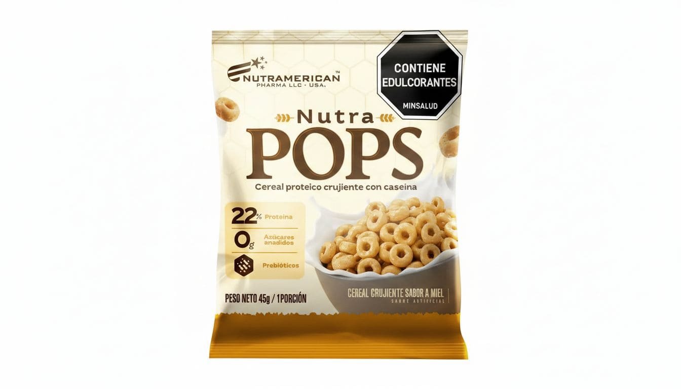 Nutra Pops Proteína de Nutramerican (versión 12 unidades) es un cereal crujiente diseñado como snack o desayuno funcional alto en proteínas (22% proteína láctea: 80% caseína/20% suero) y sin azúcar añadida. Sirve para aumentar la ingesta de proteínas, mejorar la saciedad y apoyar el bienestar digestivo gracias a sus prebióticos.