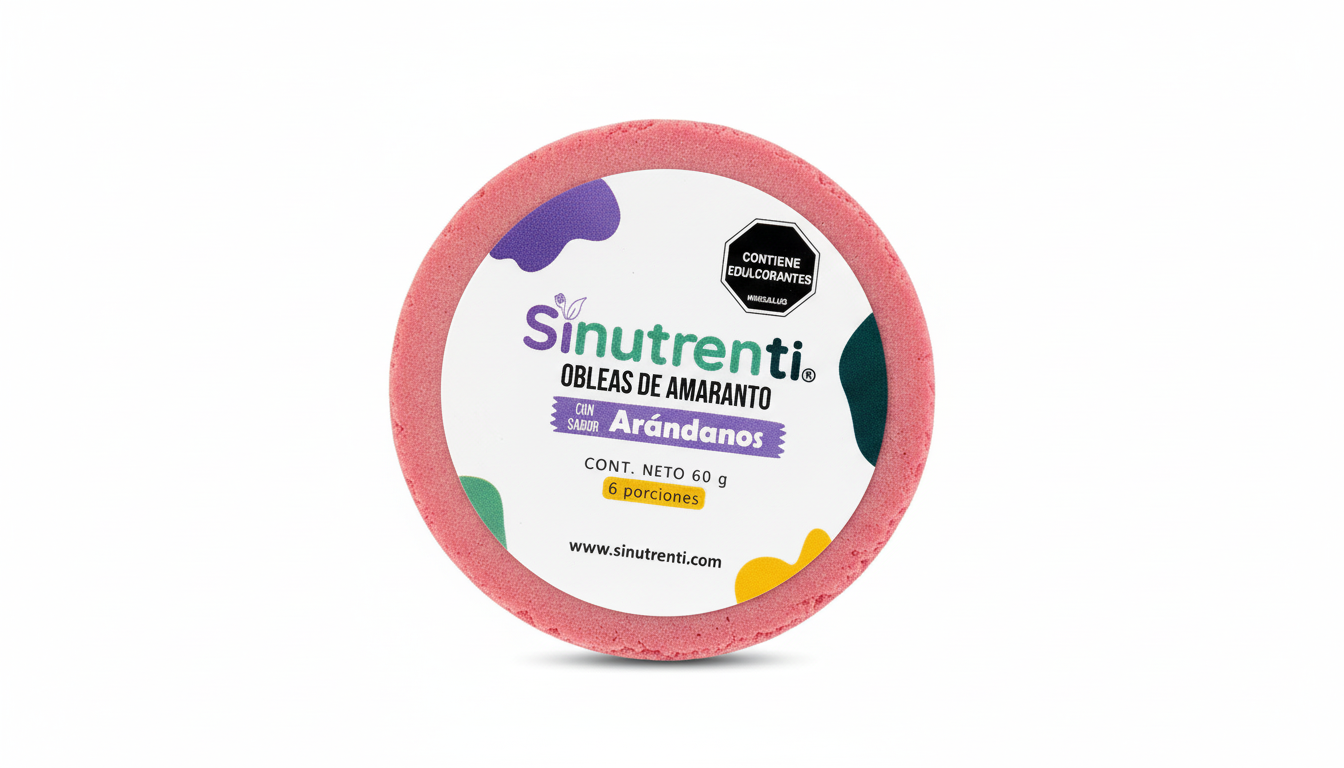 Las Obleas de Amaranto sabor Arándano de Sinutrenti (60g) son un snack saludable, crujiente y ligero. Están elaboradas principalmente a base de harina de amaranto, no contienen azúcar añadida (endulzadas con estevia), son libres de gluten, lactosa y soya, lo que las hace aptas para veganos y personas que buscan un estilo de vida saludable.