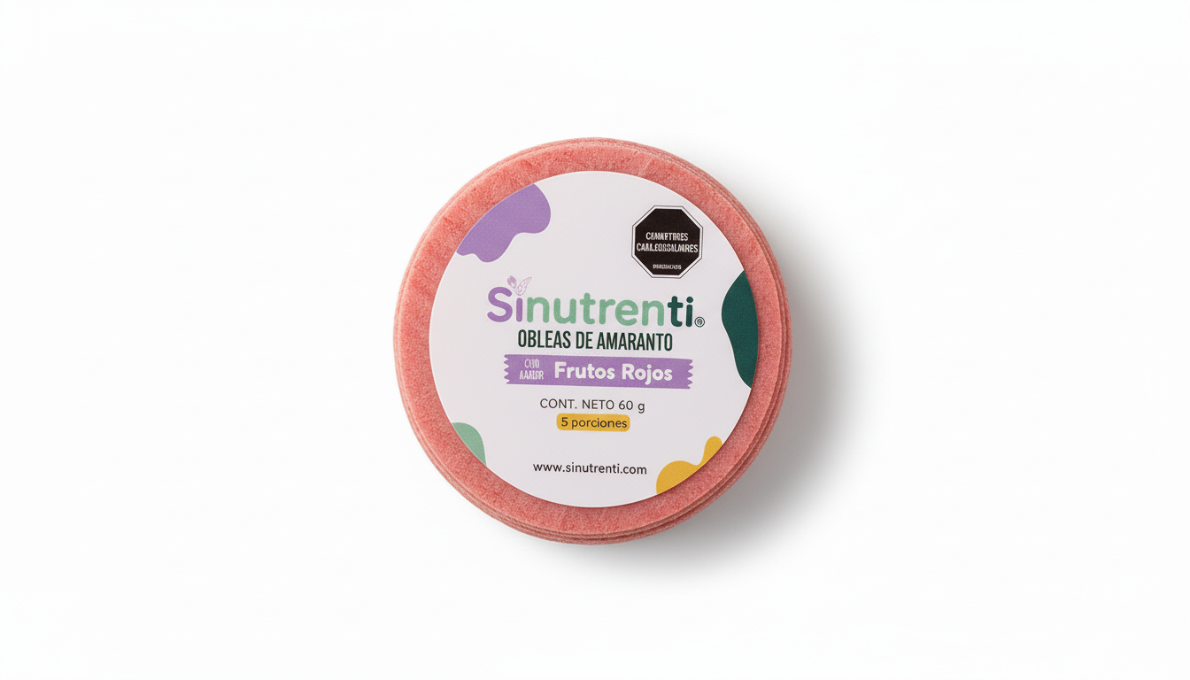 Las Obleas de Amaranto sabor Frutos Rojos de Sinutrenti (60g) son un snack saludable, crujiente y ligero, endulzado con stevia y libre de azúcar añadida. Están elaboradas principalmente a base de harina de amaranto, incorporando extractos naturales de fresas, moras, frambuesas y arándanos, son una opción vegana, libre de lácteos, baja en calorías y carbohidratos, ideal para consumir solas o acompañar con diversos toppings.