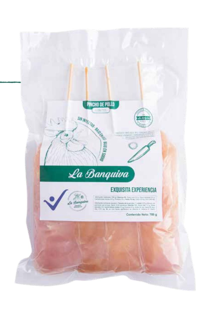 Los Pinchos de Lomito Natural La Banquiva (780-800g) son brochetas de pechuga de pollo de alta calidad, caracterizadas por ser magras, sin inyectar y bajas en sodio. Ofrecen una opción saludable y natural, libre de salmueras y polifosfatos, ideales para asar a la parrilla, sartén o airfryer, manteniendo jugosidad.