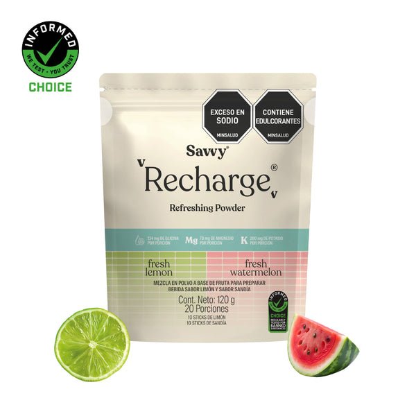 El Recharge Surtido x 20 Sticks – Savvy – 120Grs es una mezcla en polvo de sales minerales esenciales (electrolitos) y glicina, diseñada para favorecer una hidratación consciente y eficiente del cuerpo, endulzada naturalmente y sin conservantes artificiales.