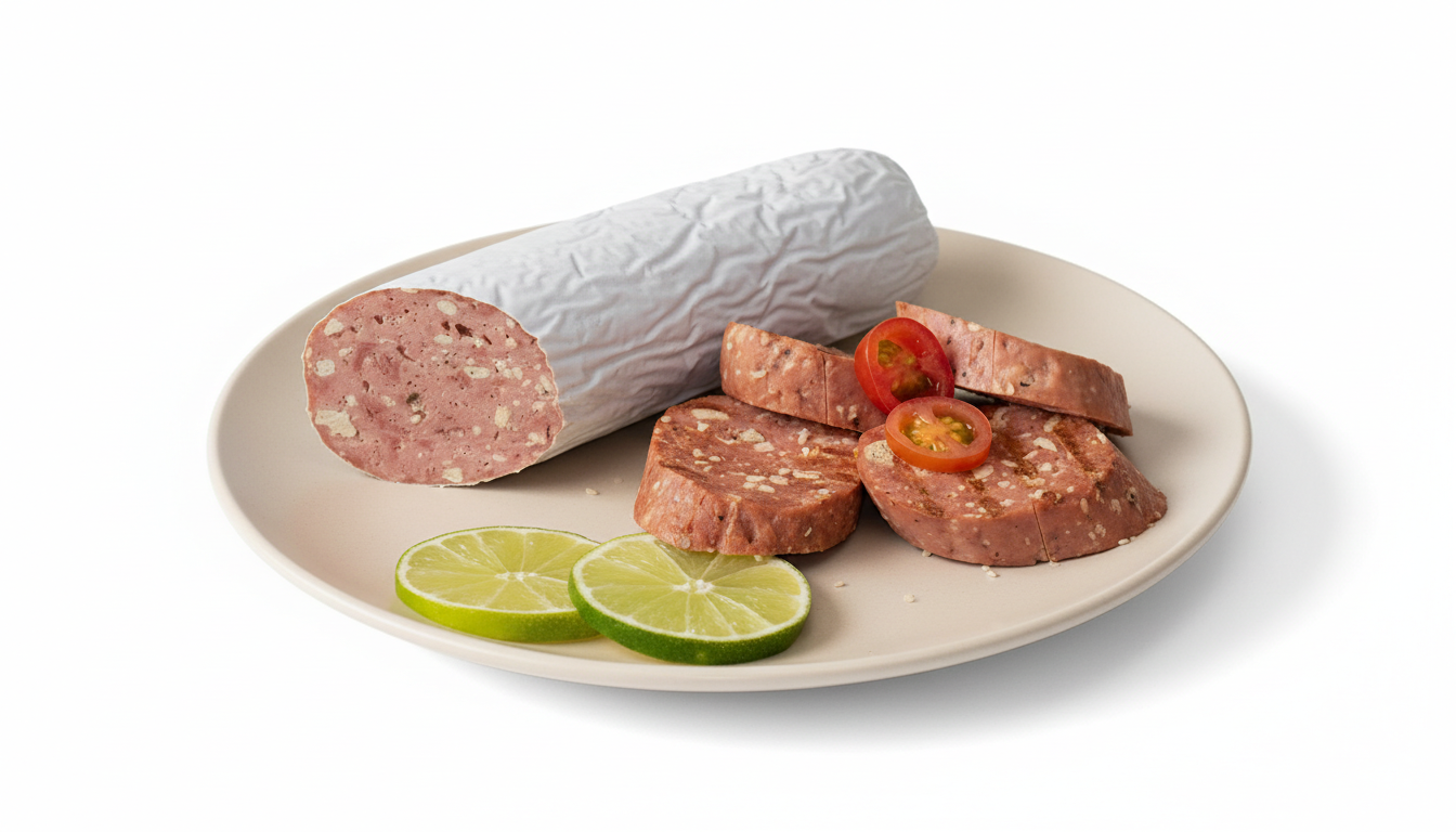 Este producto contiene soya, cereales (trigo), leguminosas (arveja), linaza, ajonjolí, sal, saborizante imitación a salami, Colorante (eritrosina), sorbato de potasio (conservante).