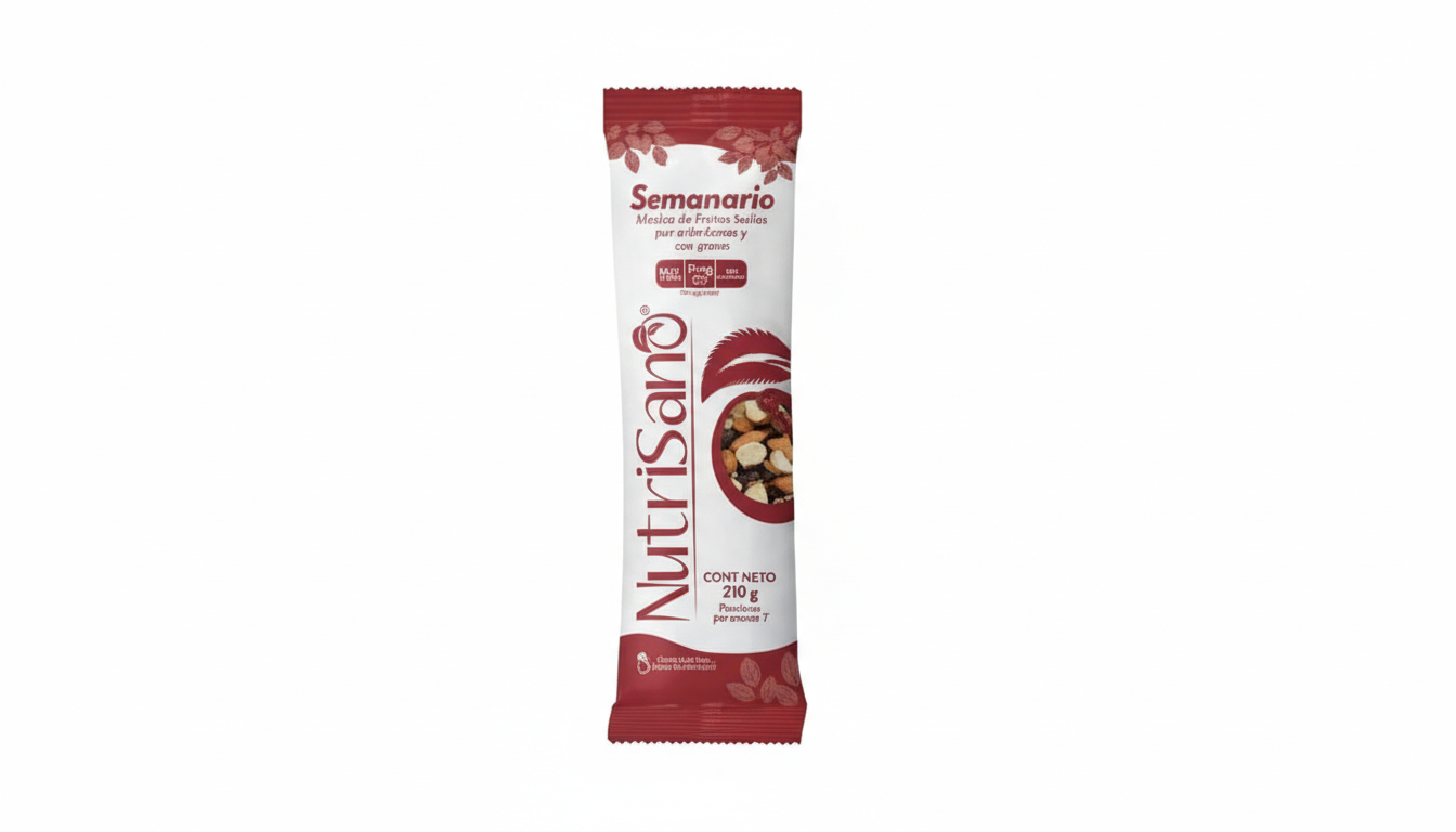 El Semanario de Frutos Secos Antioxidante de Nutrisano es una caja con 7 porciones individuales de 30g de mezcla de frutos secos y deshidratados (como nuez de Brasil, almendra, maní y marañones) y arándanos, diseñadas para un snack saludable diario, sin sal, azúcar ni conservantes, rico en antioxidantes, proteínas y grasas saludables para mantener la energía y bienestar durante toda la semana.