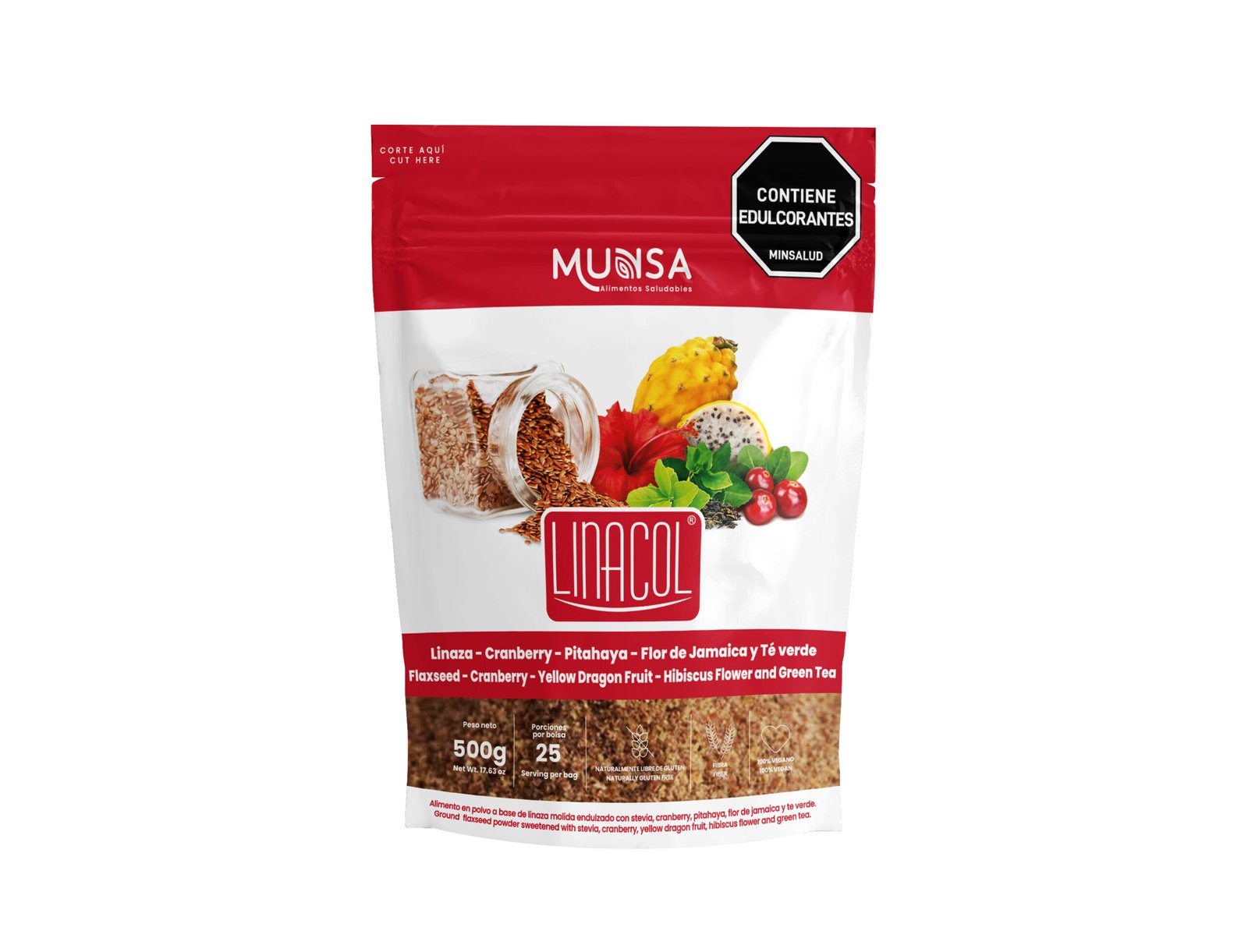 Alimento en polvo a base de Linaza molida con Cranberry, Pitahaya, Flor de Jamaica y Té verde, endulzado con Stevia.